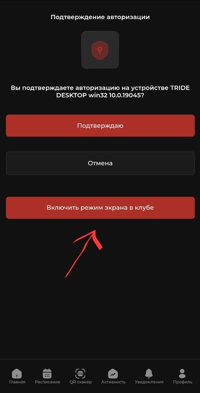 Для того, чтобы включить "клубный" режим управляемого тренировочного экрана, необходимо отсканировать куар код авторизации с экрана из приложения TRIDE с мобильного телефона и на отобразившемся экране выбрать включение режима экрана, после чего выбрать или создать зону в клубе (указав ее название и нажав "добавить", например, "Зал сайкл"), в которой данный компьютер будет работать и отображать тренировки, и нажать включить.